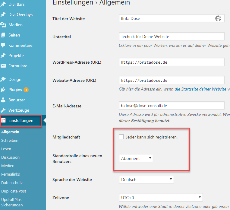 Außerdem solltest du die Seite „Einstellungen > Allgemein“ überprüfen, dort war auf meiner Site eingestellt, dass neue Benutzer direkt als Administrator angelegt werden.